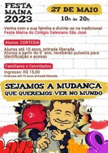 No dia 27 de maio realizaremos a tão esperada Festa Maína, este ano o tema é “Sejamos a mudança que queremos ver no mundo”. Nossos estudantes já estão fazendo valer a pena, não perca a festa mais gostosa e tradicional