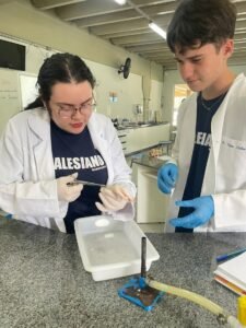 Na aula de laboratório os alunos investigaram como isso acontece! Foram utilizados pés de galinhas como modelo para observar os tendões – aquelas estruturas fibrosas que conectam os músculos aos ossos. Segundo a professora Natali: “A experiência foi incrível: ao