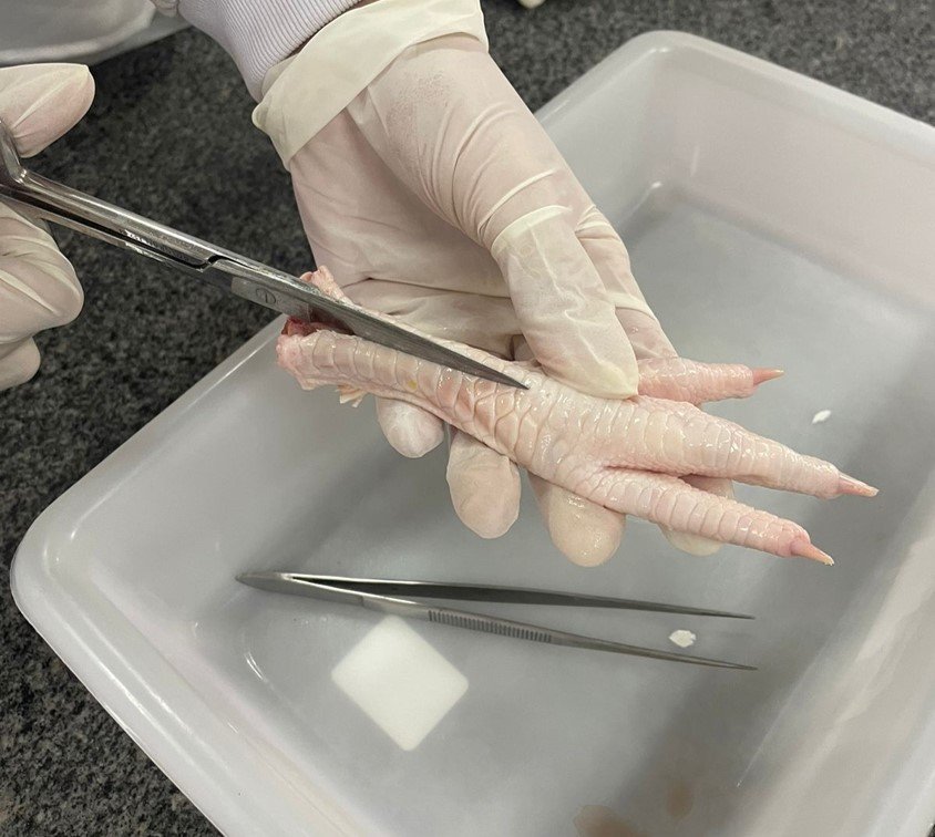 Foram utilizados pés de galinhas como modelo para observar os tendões – aquelas estruturas fibrosas que conectam os músculos aos ossos.