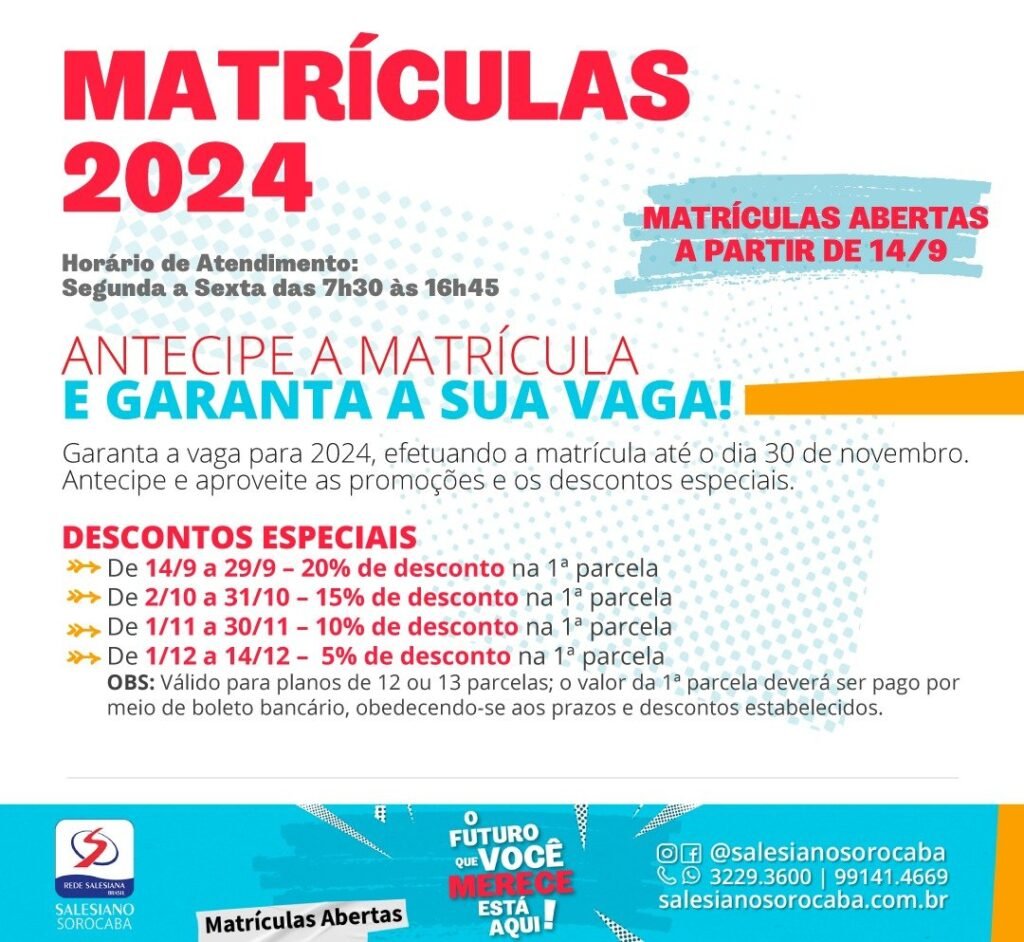 Estão abertas as matrículas para o ano letivo 2024 no Salesiano Sorocaba!