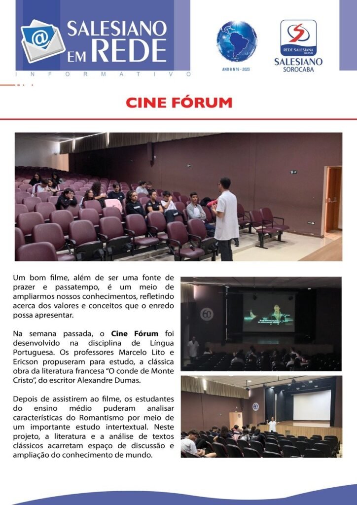 Em agosto, o Cine Fórum foi desenvolvido na disciplina de Língua Portuguesa. Os professores Marcelo Lito e Ericson propuseram para estudo, a clássica obra da literatura francesa “O conde de Monte Cristo”, do escritor Alexandre Dumas.