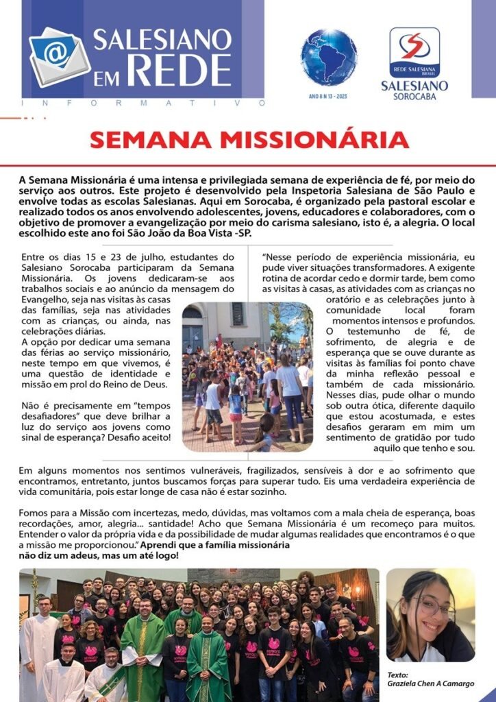 A Semana Missionária é uma intensa e privilegiada semana de experiência de fé, por meio do serviço aos outros. Este projeto é desenvolvido pela Inspetoria Salesiana de São Paulo e envolve todas as escolas Salesianas. Aqui em Sorocaba, é organizado pela pastoral escolar e realizado todos os anos envolvendo adolescentes, jovens, educadores e colaboradores, com o objetivo de promover a evangelização por meio do carisma salesiano, isto é, a alegria. O local escolhido este ano foi São João da Boa Vista -SP.